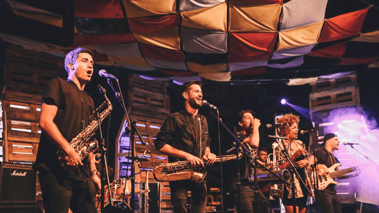 La copertura leggera è stata realizzata mettendo insieme quadrati di tessuto di colori diversi, creando uno sfondo animato ad hoc per i concerti di tutto il weekend, che hanno portato ad Imola una ventata di buone vibrazioni e spirito di aggregazione. x