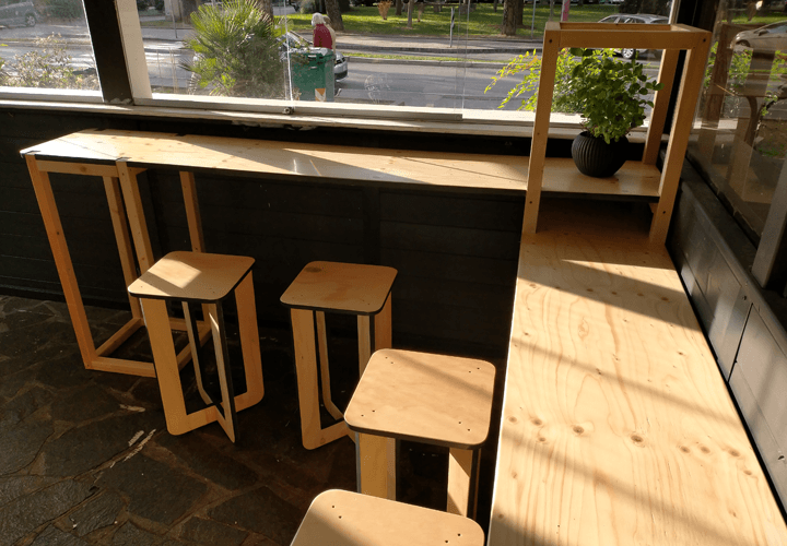 La scelta dei materiali e della loro colorazione finale è dunque ricaduta su pannelli di compensato fenolico in pino, le cui venature sono state particolarmente esaltate dal trattamento di impregnatura e applicazione di vetrificante. In questo modo abbiamo anche reso i piani facilmente lavabili e, allo stesso tempo, molto luminosi.
